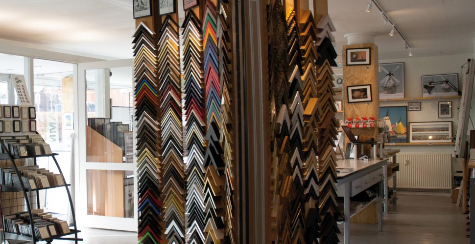 Kig ind og få et bud på din næste indramningsopgave. I butikken kan du se eksempler på det store udvalg af tilpassede rammeløsninger.
